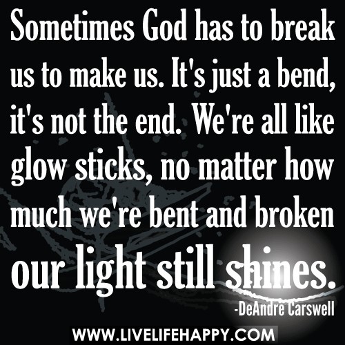 We have always heard God doesn’t give us more than we can handle and believe me there are times when I really question that. However, if you look at a glow stick you don’t see anything special at first. Once it’s bent and the inside is broken, it shines in the darkest places. That’s what God does – He brings us through the darkest times, gently bends us and breaks down the inner strongholds so God’s light and blessings shine through.